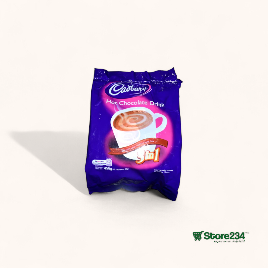 Cadbury Hot Chocolate Drink 3‑in‑1 (450 g) delivers creamy cocoa, milk, and sweetness in every scoop. Available at Store234 – your trusted online supermarket in Nigeria.